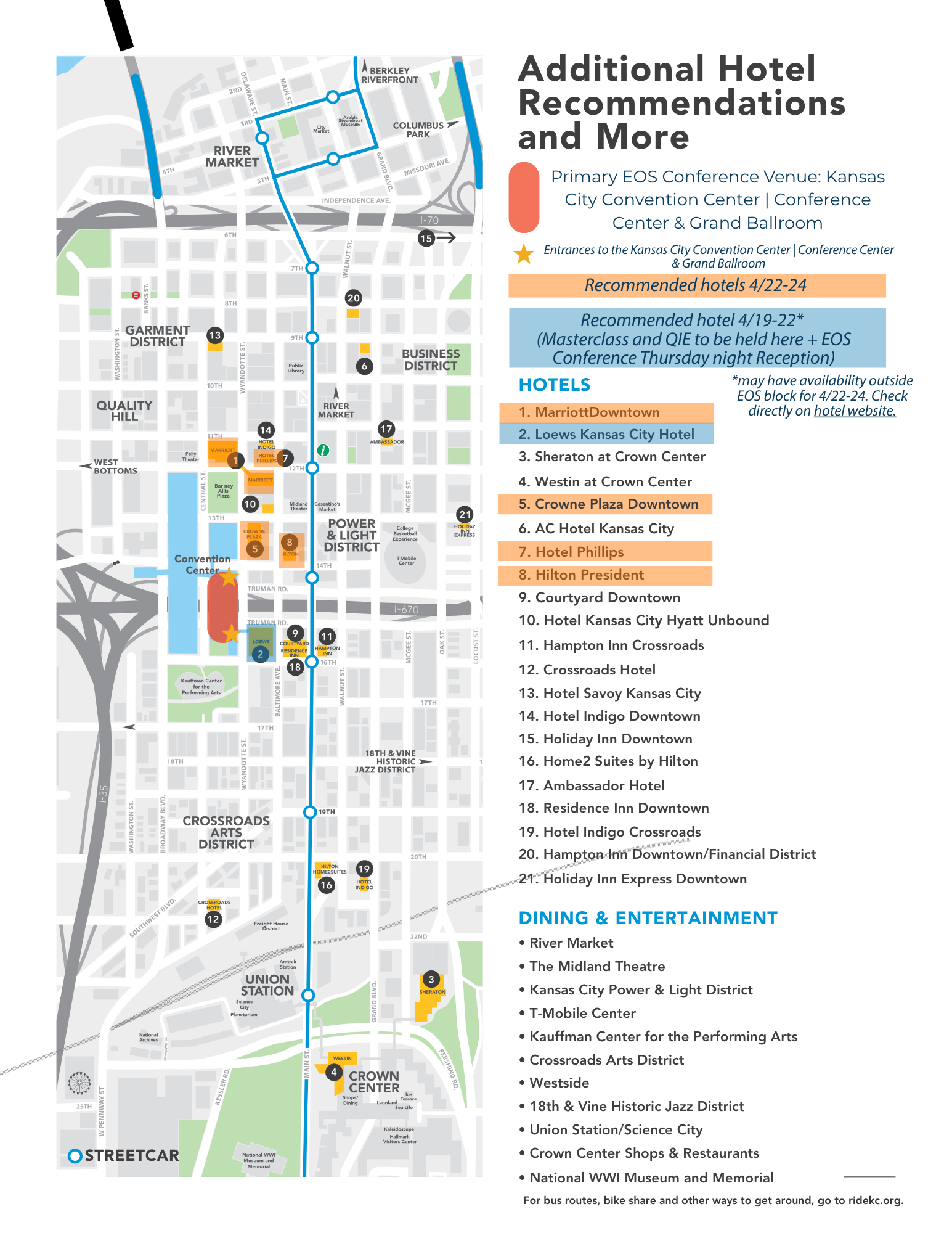 The Loews Kansas City Hotel (1515 Wyandotte Street, Kansas City, Missouri, 64108) will host the Integrator Masterclass, Visionary Masterclass, and QIE, as well as the EOS Conference Thursday night Reception.
